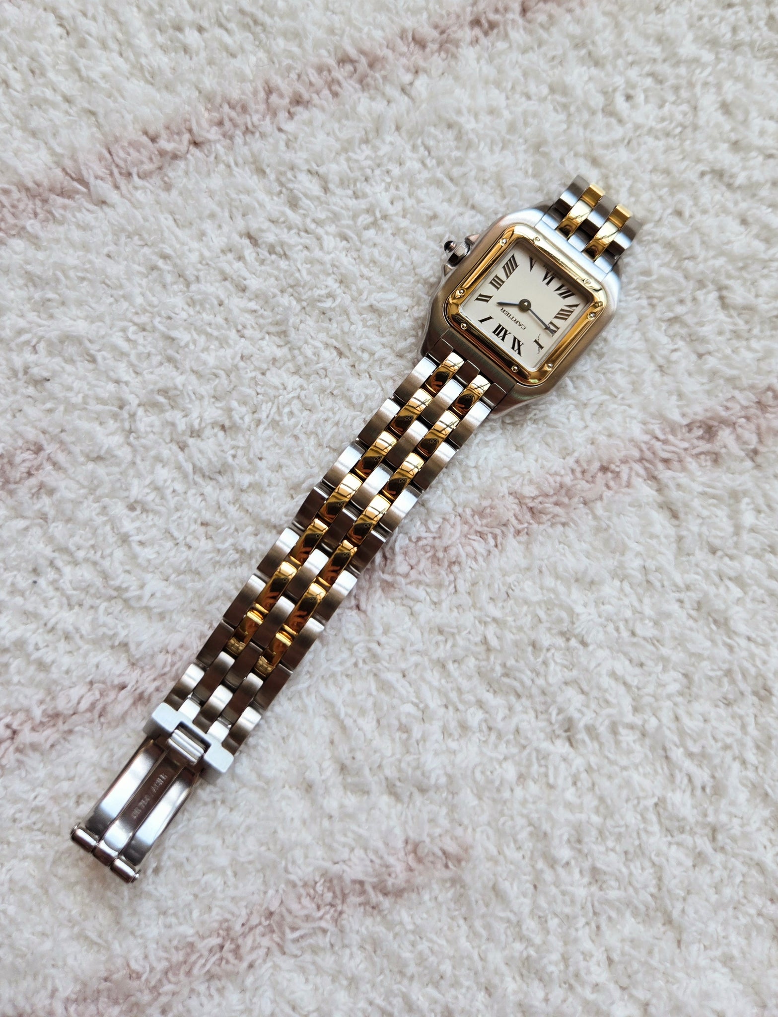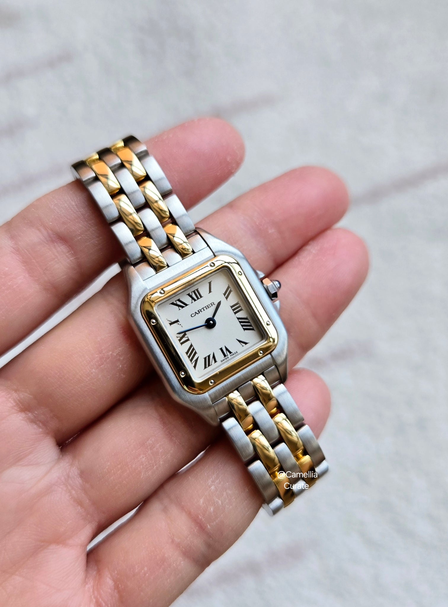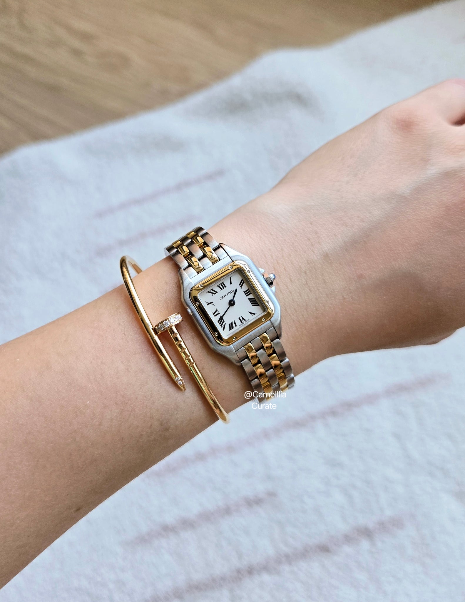 Feminine, dainty, and very comfortable with the flexible two tone gold/ss bracelet. In the small size, currently retailing for double the price. Cartier's most beloved and classic watch model for ladies in 18k Gold + Stainless steel with a Sapphire blue crown. This one usually goes for well above 6k in the market space, grab her at a good deal!