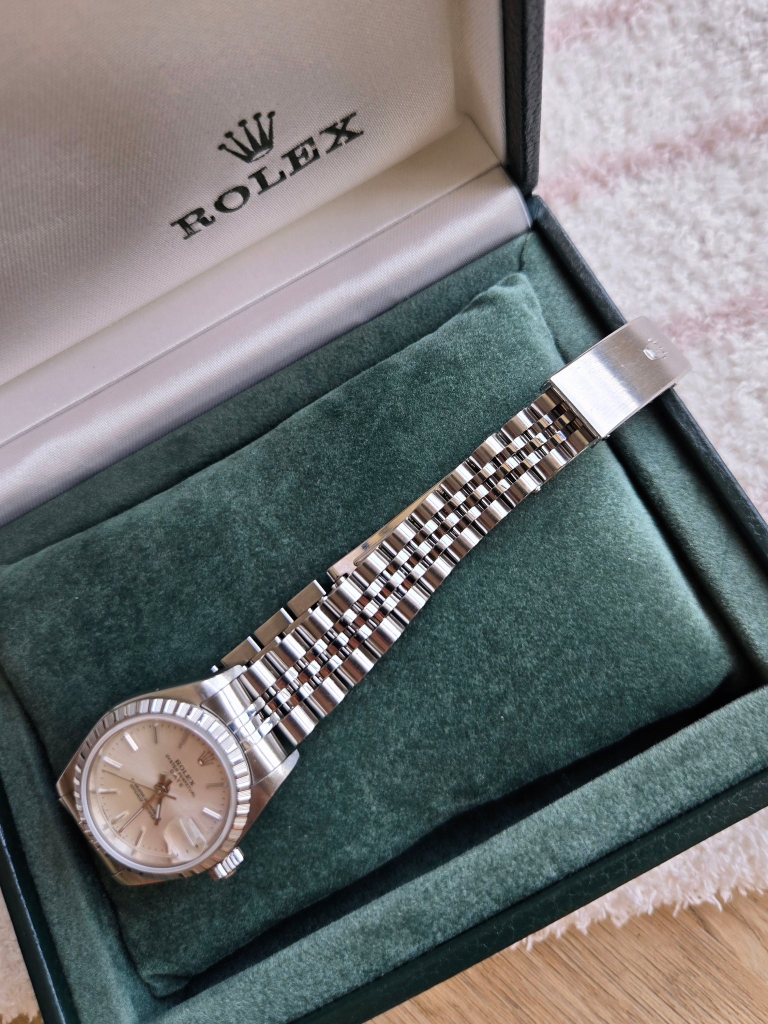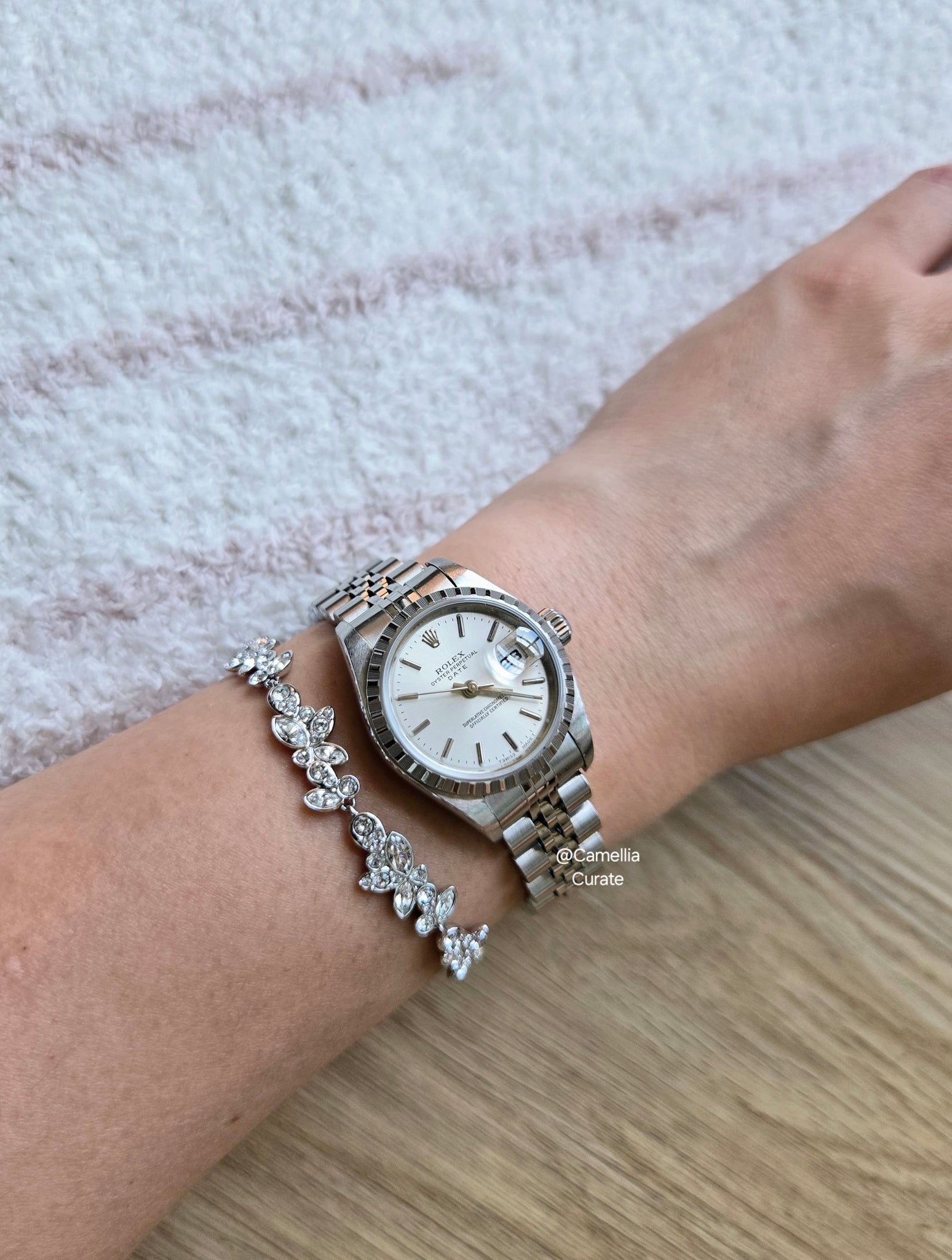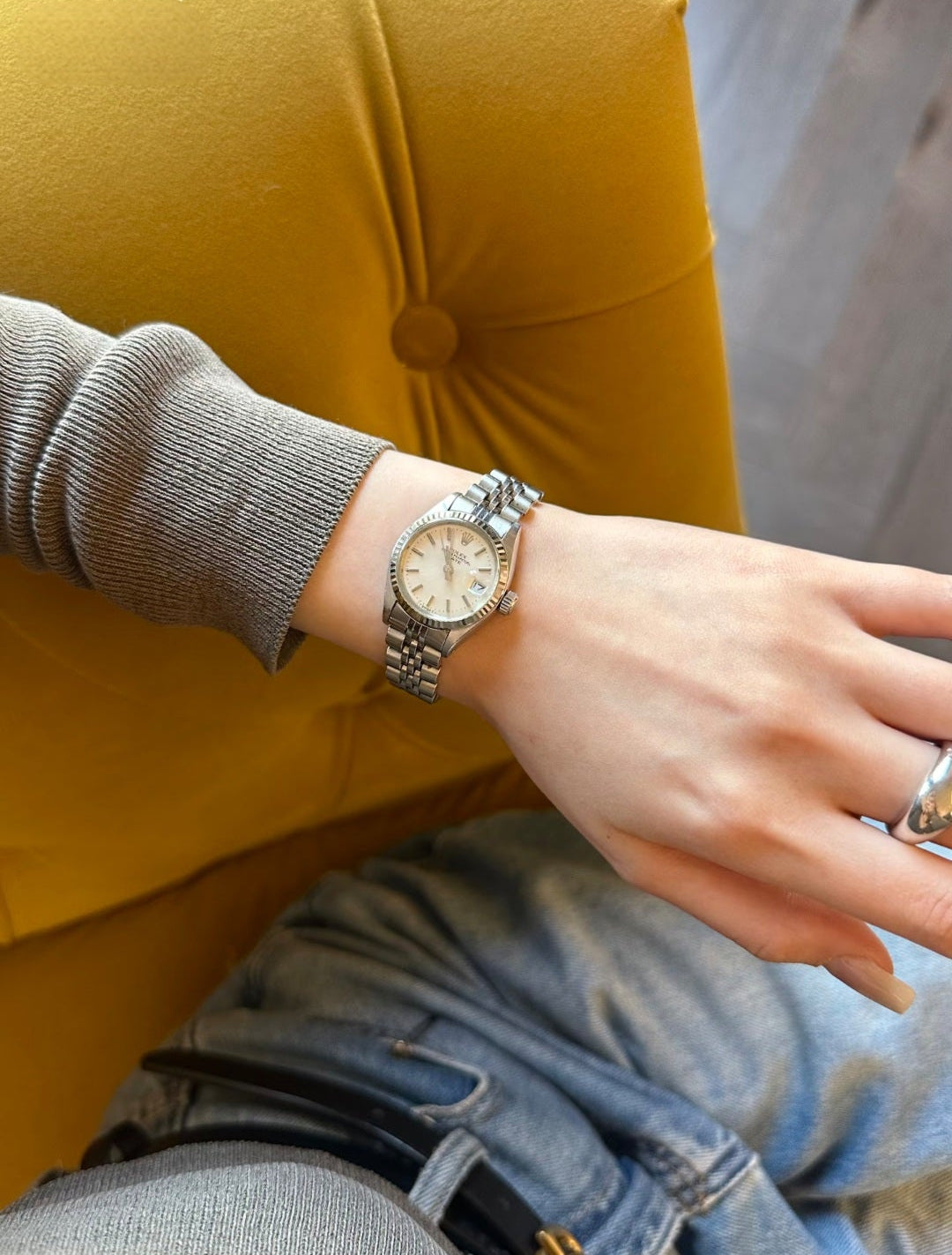 Feminine, lightweight, super versatile for elevating your everyday style! Classic Rolex silver cream dial, no scratches on its Sapphire crystal case. Rank A, no significant flaws to note.