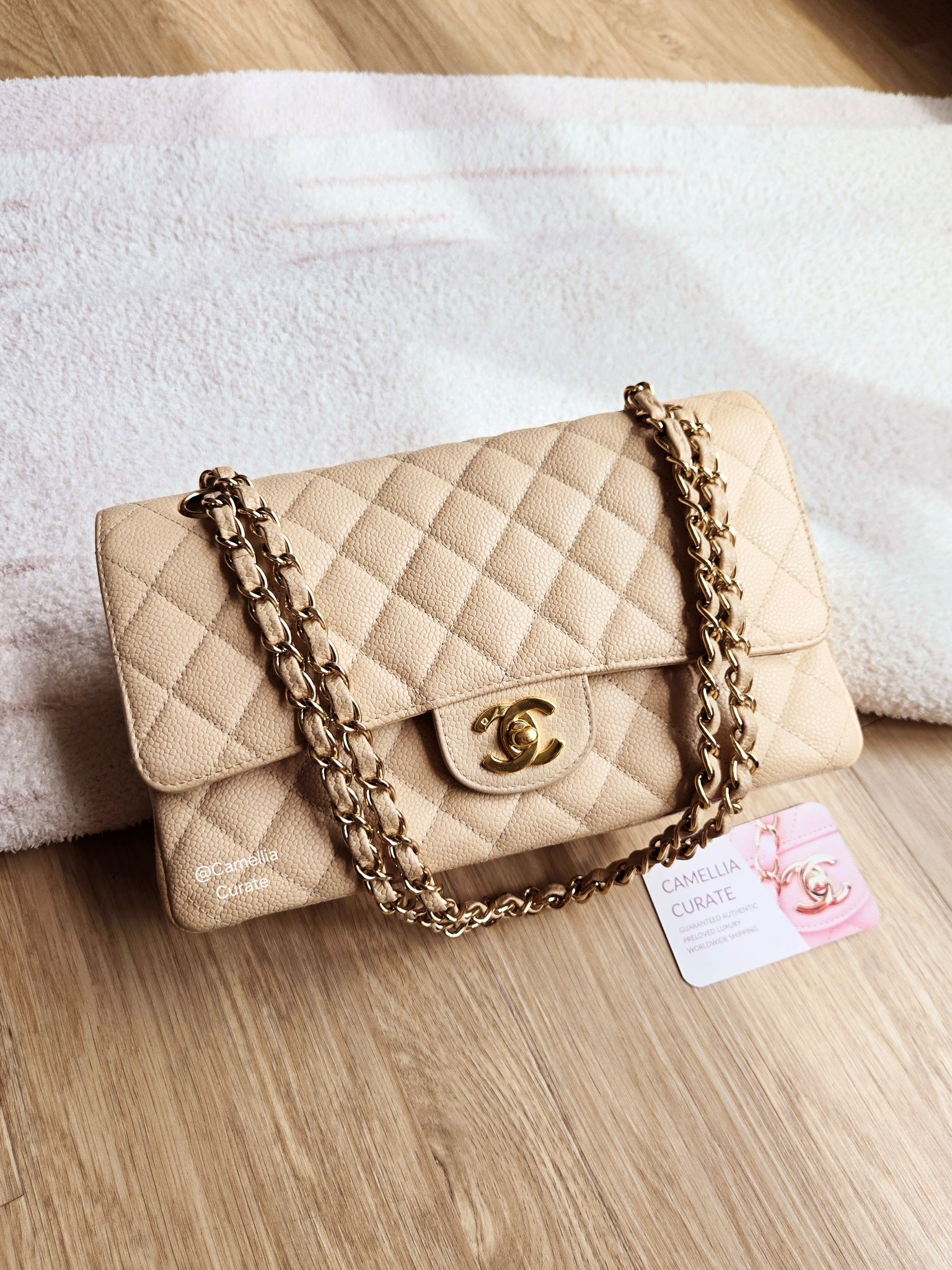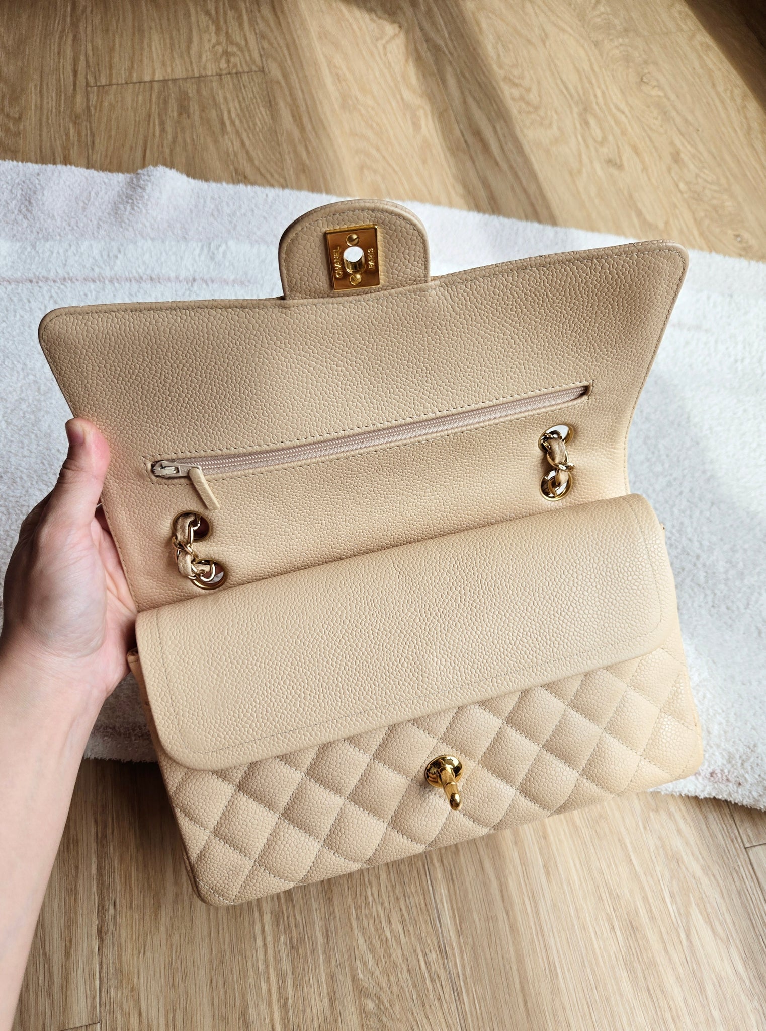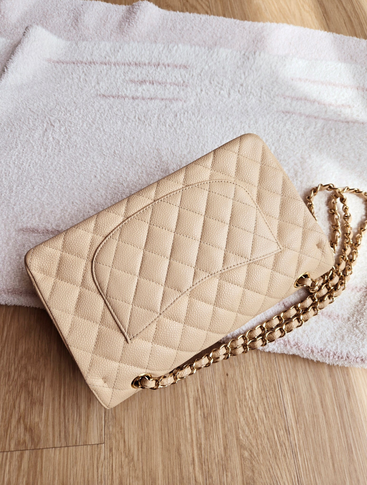 Chanel Classic Medium Flap Beige Claire Caviar 24k Gold