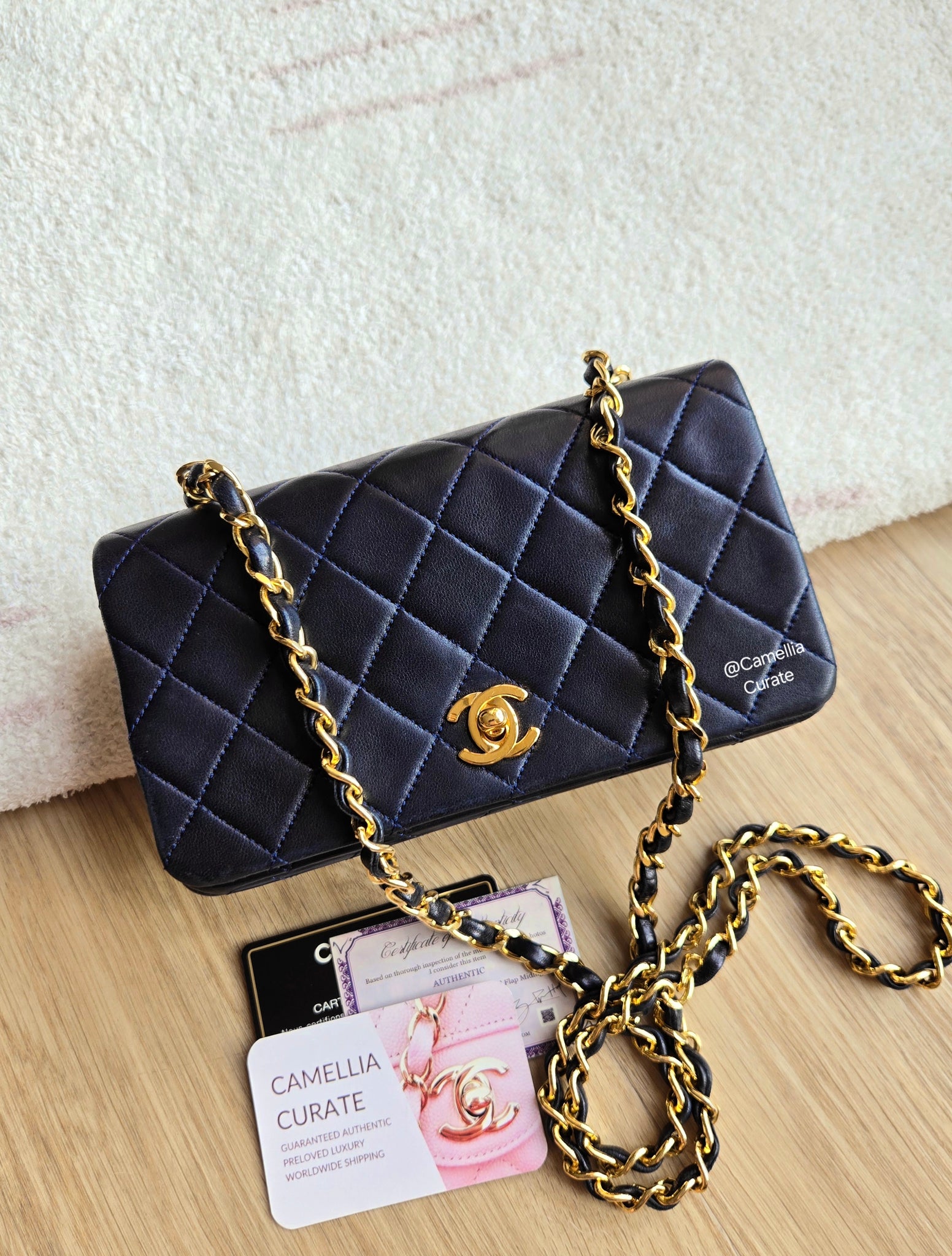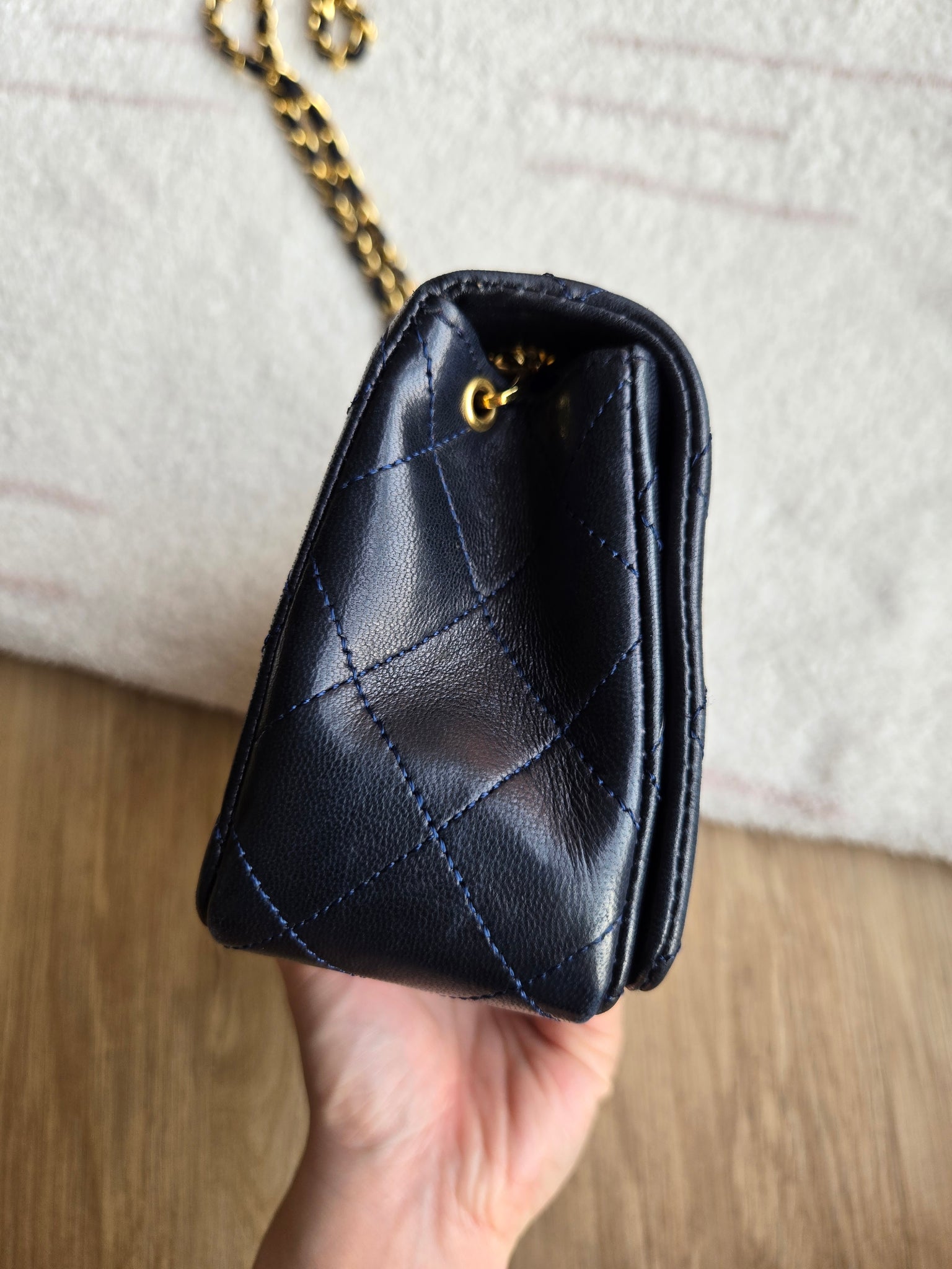 The original version of the classic mini rectangle flap! Wear her crossbody, on the shoulder, or as a clutch. Strap can be adjusted to any length easily for versatility! Buttery soft durable vintage leather, gorgeous navy colour that goes with both lighter and darker outfits, beautiful contrast with the deep 24k gold ✨️